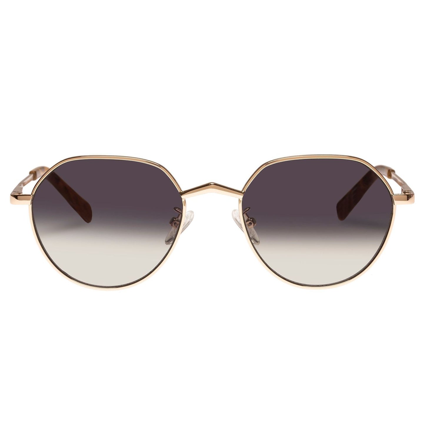 Reworking the proportions of a classic round silhouette, this unisex sunglass in gold features a slimline metal rim and a look reminiscent of the 1990’s. Designed with a luxurious metal pinstripe detail around both lenses, the style is fitted with spring hinges to suit all face shapes and sizes.